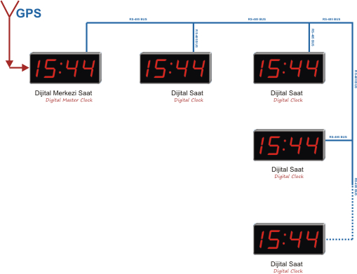 Central Clock System. Synchronisation process can be performed over GPS , ETHERNET , RADIO , WIRELESS